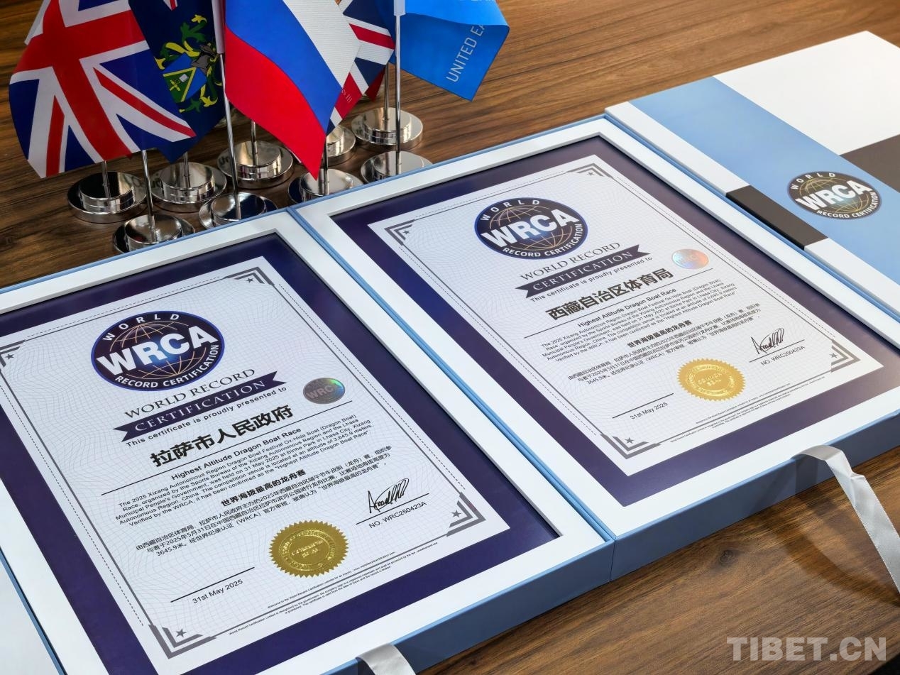 世界纪录认证机构(WRCA)认证官马克先生发来贺电;WRCA中国区认证官王静女士现场宣布了世界纪录认证结果;WRCA中国区负责人、世界纪录申报中心主任赵青太为西藏自治区体育局、拉萨市人民政府颁发了“世界海拔最高的龙舟赛”世界纪录认证书。