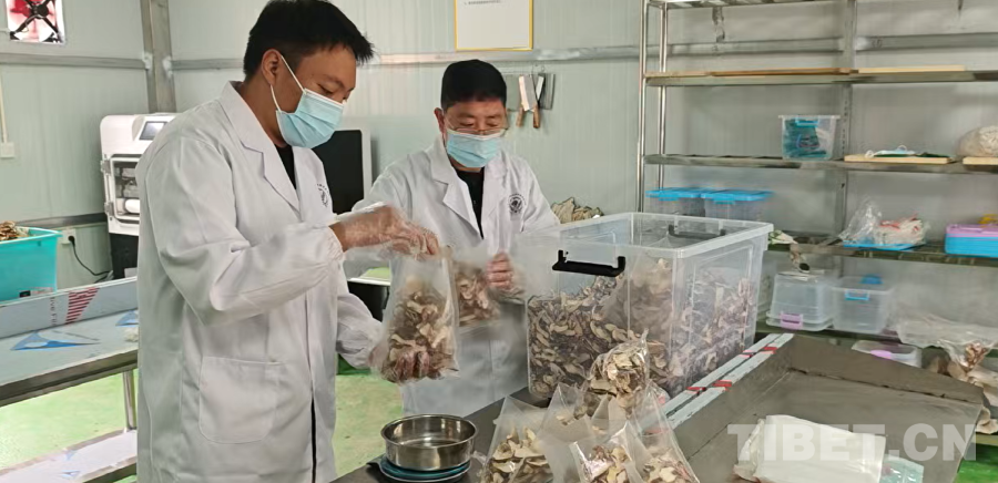 图为驻村工作队和村两委在扎西村松茸加工厂包装松茸干片