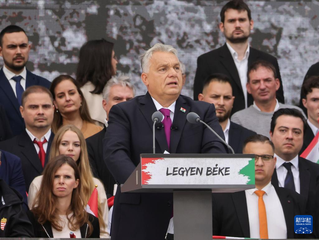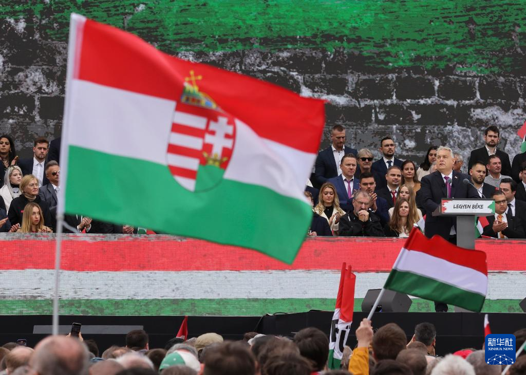 10月23日,匈牙利总理欧尔班(前右)在首都布达佩斯举行的一场集会上讲话。新华社发(弗尔季·奥蒂洛摄)