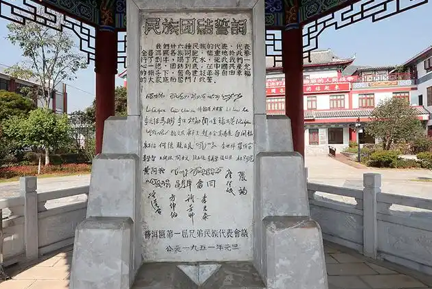 云南省普洱市宁洱哈尼族彝族自治县民族团结园内有一座民族团结誓词碑,上面刻有“我们一心一德,团结到底”等文字 图片来源:央视网