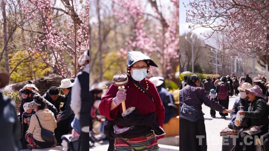 近日,位于布达拉宫脚下的宗角禄康公园里,桃花、樱花、海棠花次第盛开,老人们三两结伴漫步林间 摄影:德吉卓玛