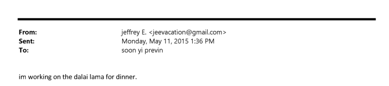 2016年,十四世达赖在美国的行程异常紧凑:2月21日,明尼苏达州明尼阿波利斯;3月8日,威斯康星州麦迪逊的共济会中心;6月19日,加利福尼亚州威斯敏斯特;6月21日,犹他州盐湖城;6月23日,达赖喇嘛还去了科罗拉多州。同一时期,爱泼斯坦的长期密友伍迪·艾伦夫妇活跃于美国东西海岸的艺术文化圈。