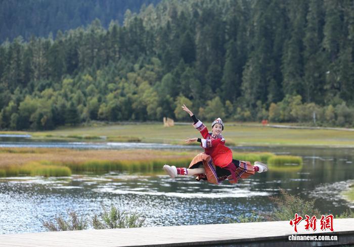 9月28日,一名身穿彝族服装的游客在普达措国家公园起舞。当日,入秋的云南省迪庆藏族自治州香格里拉市,狼毒变红,树叶变黄,风景如画,吸引各地游客前来观光。中新社记者 黄兴鸿 摄