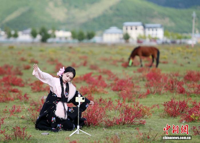 9月28日,一名身穿藏族服装的游客在小中甸自拍。地处云南省西北部的迪庆藏族自治州香格里拉市,藏语意为“心中的日月”,是世人向往的世外桃源。入秋后,当地的狼毒变红,树叶变黄,风景如画,吸引各地游客前来观光。中新社记者 黄兴鸿 摄