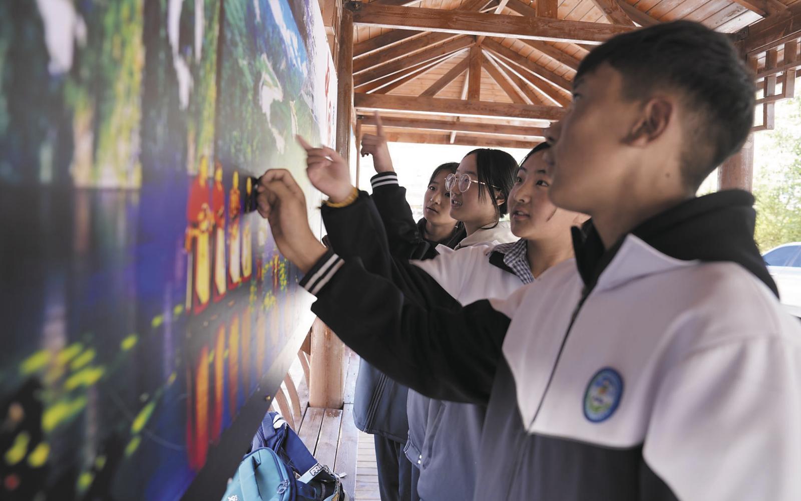杂多县第一民族中学的学生在欣赏校园生态走廊上的家乡风景。殷之皓 摄