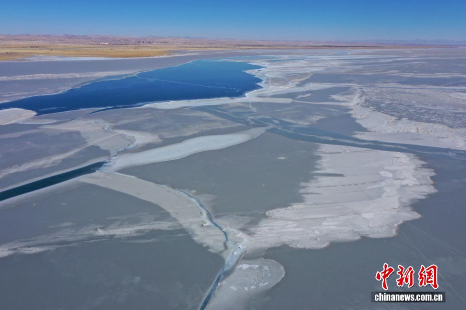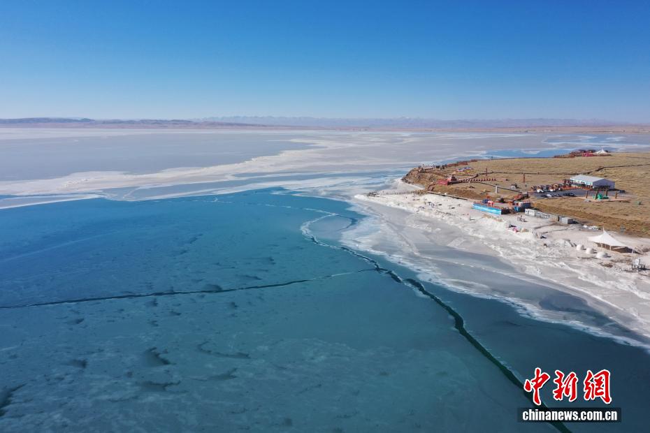 2月13日,青海省海北藏族自治州刚察县圣泉湾景区,中国最大的内陆咸水湖青海湖已进入封冻期。昔日碧波荡漾的湖面被厚冰覆盖,冰裂纹理如大地墨痕,与远处高山相映成画,尽显高原冬日的静谧。(无人机照片)中新社记者 张忠苹 摄