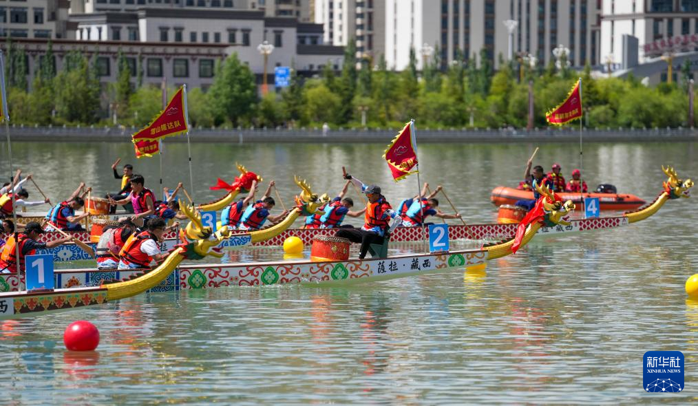 当日,2025年西藏自治区端午节牛皮船(龙舟)赛在拉萨滨河公园水域举行。来自全国各地的160名选手组成的10支龙舟队伍和20支牛皮船队伍同在高原竞渡,吸引众多观众到场观看。