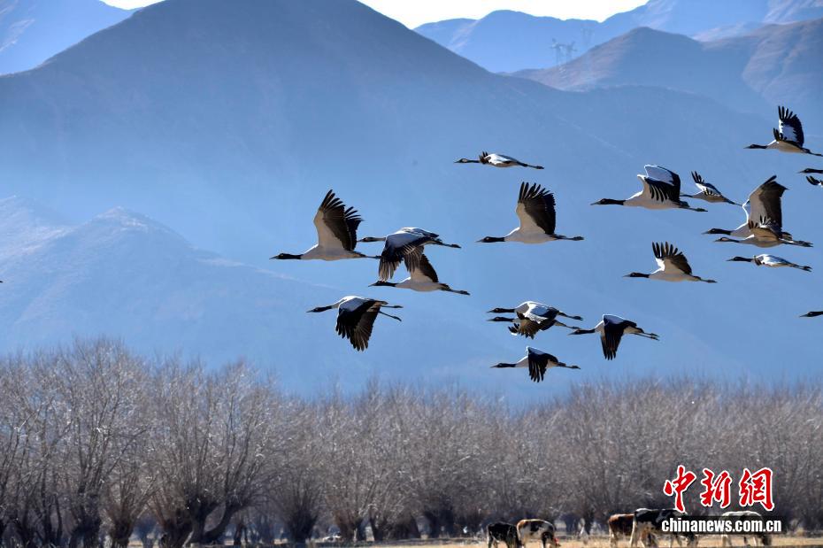11月14日,西藏日喀则市桑珠孜区边雄乡越冬的黑颈鹤。黑颈鹤是全球十五种鹤类中唯一在高原地区繁殖和越冬的鹤类,属中国国家一级保护动物。每年10月中下旬左右,黑颈鹤陆续飞抵雅鲁藏布江中游河谷等地越冬。它们漫步田间地头、悠闲觅食,为雪域高原的冬日增添了一道灵动的风景线。中新社记者 李林 摄
