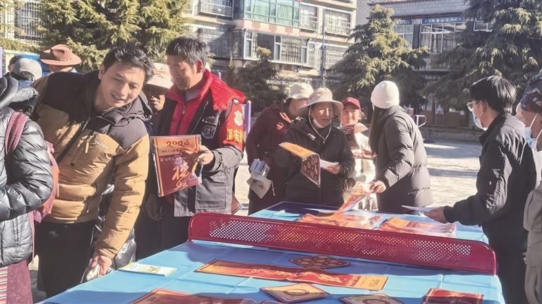 拉萨市城关区纳金路北社区的活动现场暖意涌动、人气颇旺,居民有序参与义诊、春联赠送等便民服务。纳金路北社区组织医疗专家开展健康咨询与健康知识普及,细致回应居民健康诉求;西藏毛主席像章博物馆精心定制兼具藏式特色与美好寓意的春联,免费发放给现场群众。大家接过满载祝福的春联,脸上洋溢着幸福笑容,彼此互致新春问候,现场欢声笑语、暖意融融,浓浓的年味儿与民族团结的温情交织弥漫,节日氛围喜庆浓厚。