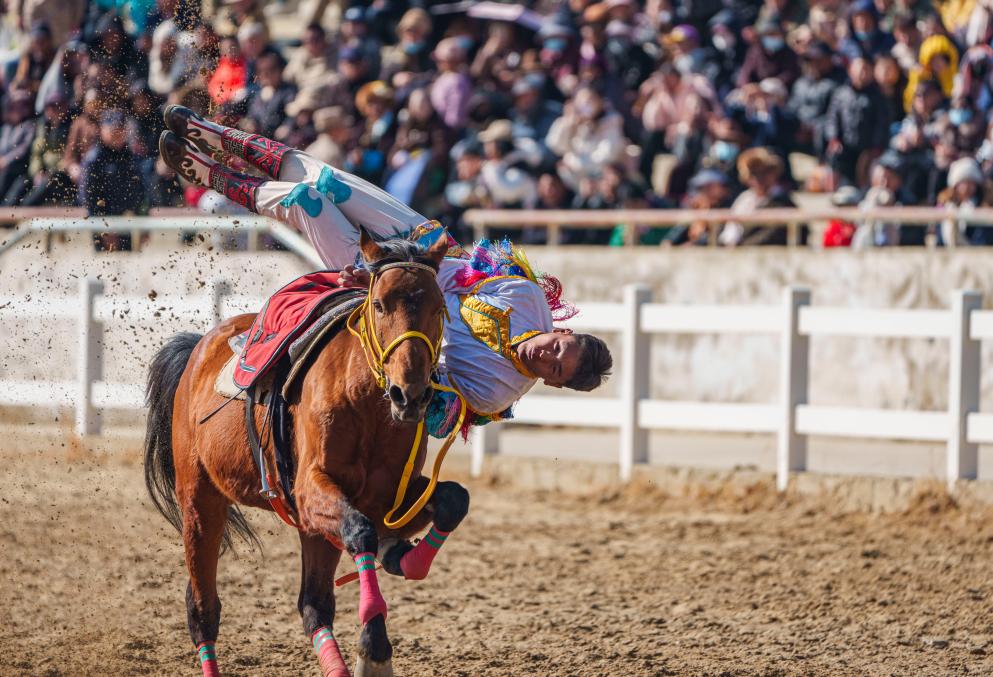 2月20日,马术队员在表演马上拾哈达。新华社记者 丁增尼达 摄