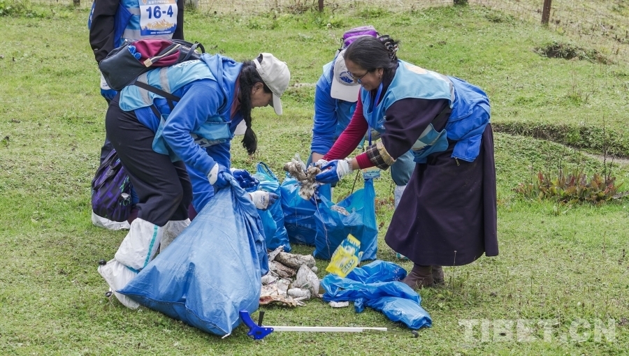 图为志愿者们在鲁朗小镇周边捡拾垃圾