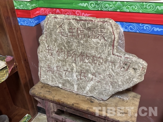 如今,松安寺内有一座专门设立的红色文物陈列室,长青介绍道,这座红色文物陈列室是现任活佛罗让甲央在当地政府支持下筹建而成。陈列室广泛收集了有关红色文物进行集中展示,供僧众和信教群众参观学习。有一块石刻被视为“镇馆之宝”,上面刻着毛主席的语录“我们所做的一切都是为人民服务”。石刻是寺庙在维修僧房时从房基下发现而挖出的,年代久远,也见证了历史里精神的传承。