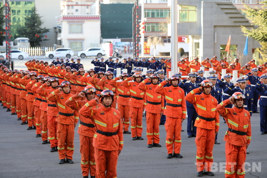 仪式在庄严的升国旗仪式中拉开序幕。雄壮的《义勇军进行曲》响彻高原,鲜艳的五星红旗冉冉升起,全体参会人员肃立注目、神情庄重,向国旗致以崇高敬意。升旗仪式结束后,相关领导共同为“拉萨消防救援机动支队”揭牌,随着红绸缓缓落下,现场掌声雷动,标志着这支传承高原火焰蓝光荣传统、肩负全新使命的救援机动队伍正式组建成立。