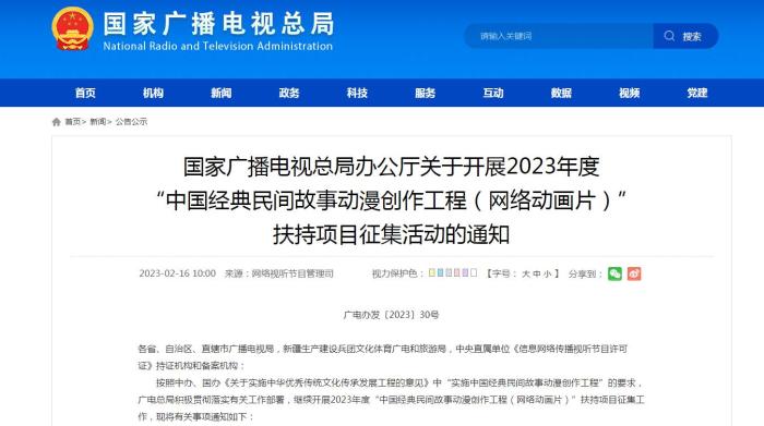 中新网2月16日电 16日,国家广播电视总局办公厅发布关于开展2023年度“中国经典民间故事动漫创作工程(网络动画片)”扶持项目征集活动的通知,旨在打造广受观众认可、具有较大影响力的优秀作品。