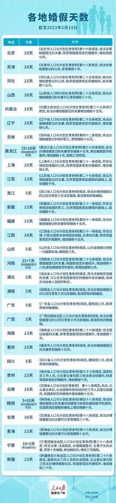 在一份全国各地婚假天数表中,具体的婚假天数,各省的差距颇大。其中,浙江等省份只有3天。