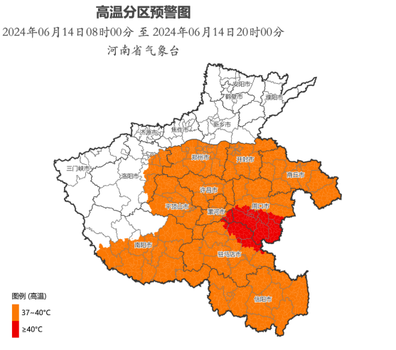 河南省气象台2024年6月14日8时继续发布高温橙色预警:预计6月14日白天,洛阳东部、郑州、开封、商丘、平顶山、许昌、漯河、周口、南阳东部、驻马店、信阳大部最高气温将升至37℃以上,其中周口南部、驻马店北部最高气温将升至40℃以上。