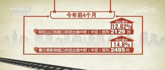 最新统计显示,今年前4个月,阿拉山口铁路口岸进出境中欧(中亚)班列2129列,同比增长12.82%。霍尔果斯铁路口岸进出境中欧(中亚)班列2485列,同比增长14.8%,亚欧“黄金通道”作用日益突显。