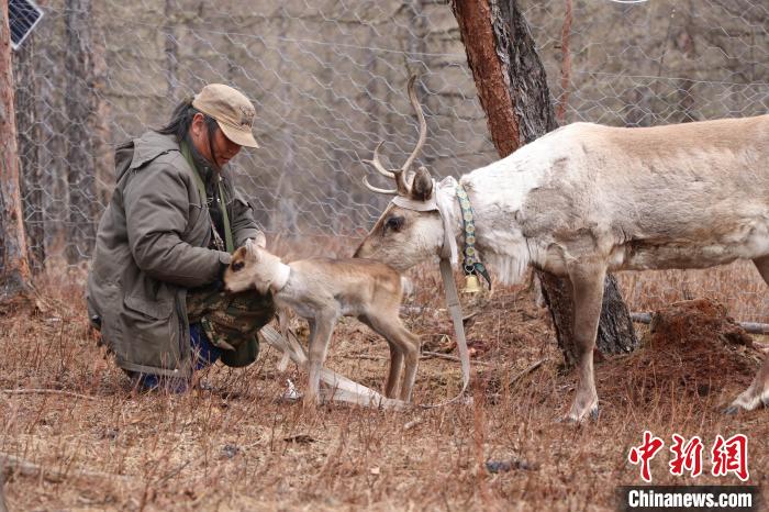 4月中下旬,敖鲁古雅鄂温克使鹿部落进入驯鹿集中产仔季,达琳玛正在拴刚出生的小鹿。(根河市融媒体中心供图)