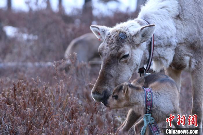 4月中旬至5月下旬是驯鹿集中产仔季,驯鹿妈妈与鹿宝宝亲密互动。(根河市融媒体中心供图)
