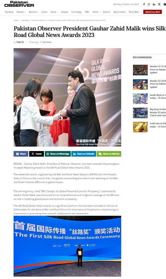 《巴基斯坦观察家报》网站报道首届国际传播“丝路奖”颁奖活动
