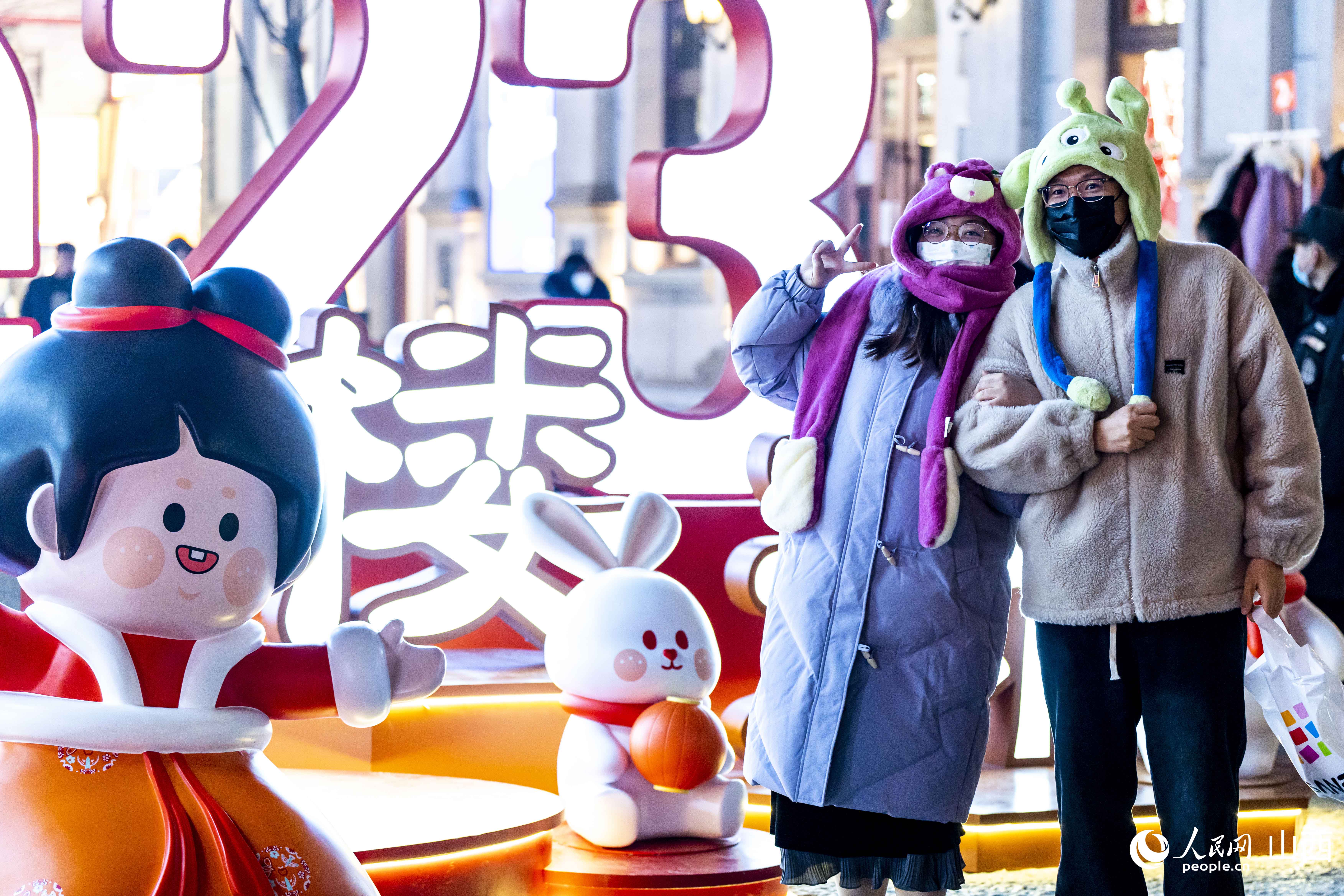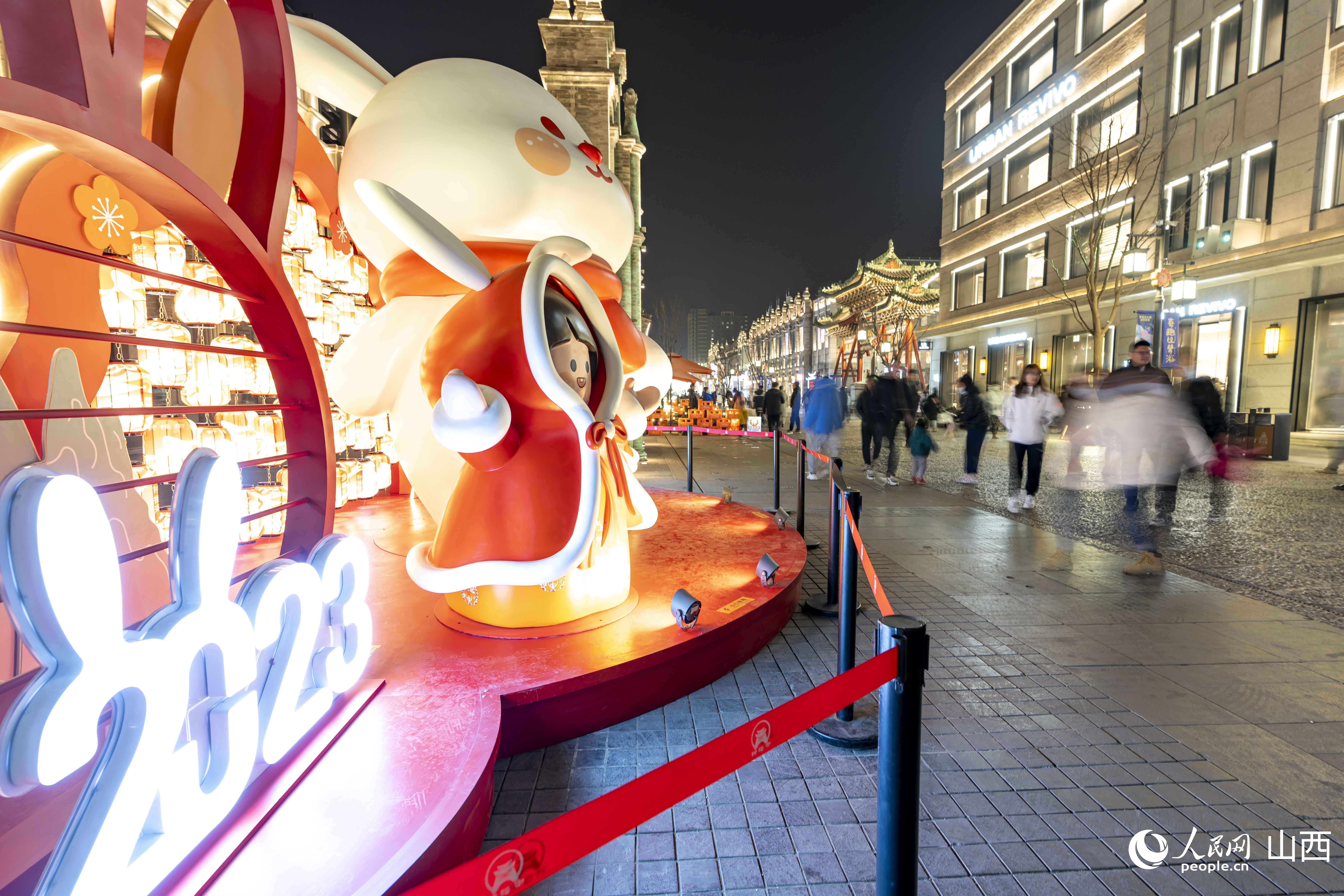 每逢夜幕降临,钟楼街上灯光璀璨,人头攒动。随处可见的新年兔子元素,为城市增添了年味,游客纷纷驻足拍照,喜气洋洋,年味儿十足。