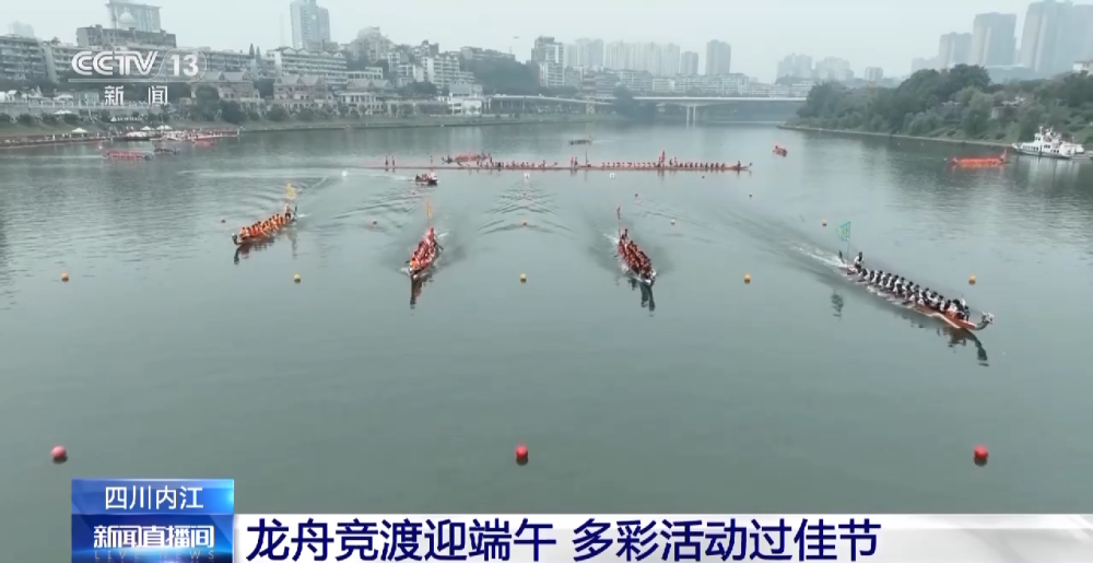 总台记者 赵雄:我现在是在四川内江市的沱江河畔,我身后的水面上进行的是今年端午节的划龙舟比赛。在现场我们可以看到,水手正在根据锣鼓声的节奏,快速地抢划船桨,四艘并排的龙舟快速地冲向终点。今年的龙舟比赛共分为四组,实行一轮定胜负,按时间进行最终排名。