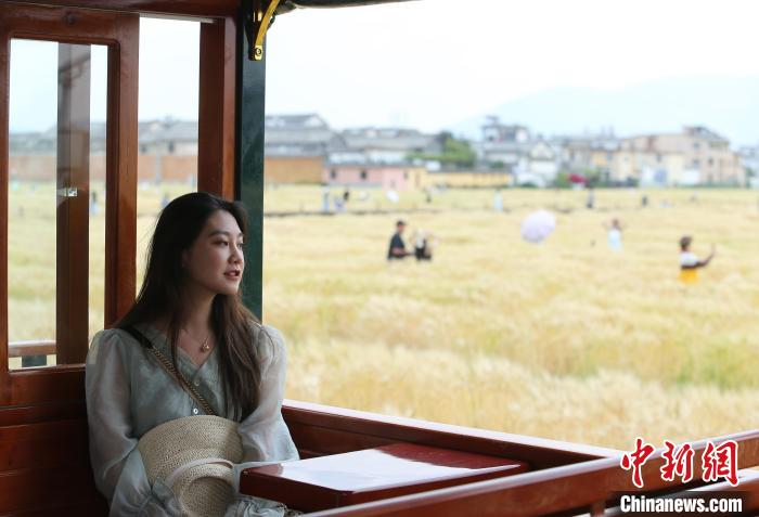 图为2024年4月24日,游客在大理白族自治州乘坐观光小火车游览麦田。黄兴鸿 摄