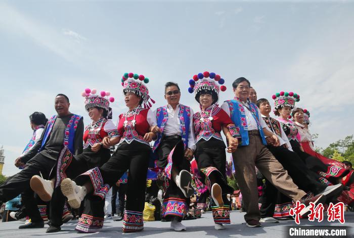 图为2024年5月5日,云南省楚雄彝族自治州牟定县的民众跳左脚舞庆祝“三月会”。黄兴鸿 摄