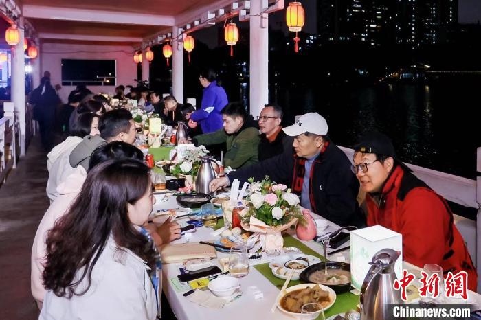 中新网广州4月1日电 (记者 孙秋霞)广州泮塘长桌宴31日晚在荔湾湖贴水长廊亮相,今年的长桌宴以“荔湖春水”为灵感重构西关滋味,百米宴席临湖而设,传统西关味道与荔湾湖美景相映成趣,重现古代饮宴场景。