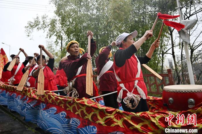 3月5日,号子爱好者在岳池县罗渡镇渠江号子传习所开展旱龙舟、龙舟号子训练。 中新社记者 张浪 摄