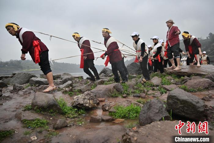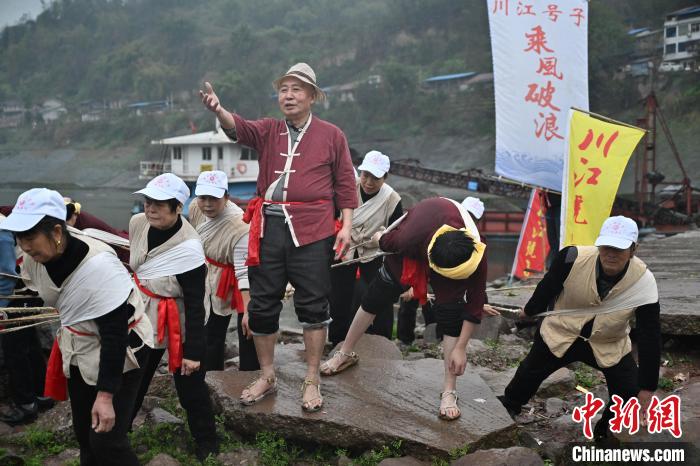 中新社四川岳池4月9日电 题:峡锁奔流浪打山,川江号子声震天