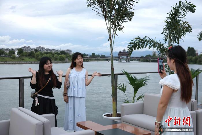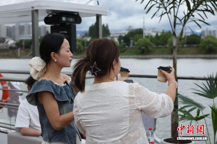 在游轮二层甲板上,游客手捧咖啡,以新安江为背景拍照打卡。江婉琪 摄