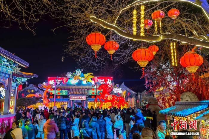 2月18日晚,天津西青区杨柳青古镇,八方游客纷至沓来,逛古街、赏花灯、看民俗、品津味,在沉浸式体验中解锁“年画里的中国年”。图为市民和游客在古街游玩。记者 佟郁 摄
