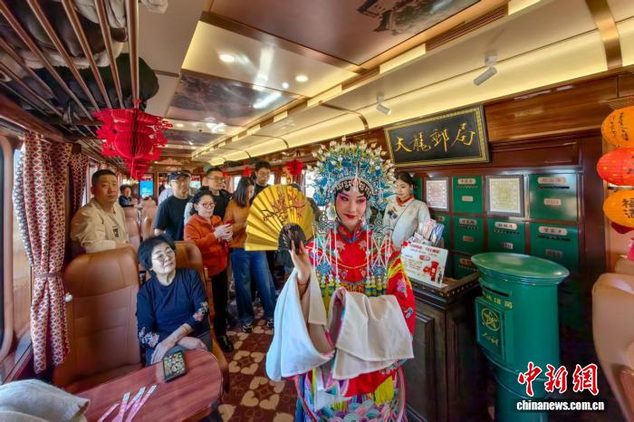 2月18日,京津两地游客在“津旅时光号”新春专列上观看京剧演出。 记者 佟郁 摄