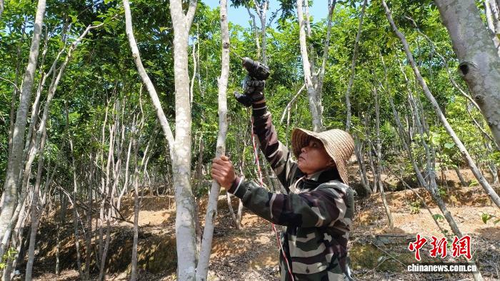 3月6日,广东茂名市电白区,合利村香农正在给沉香树打孔造香。王启腾 摄