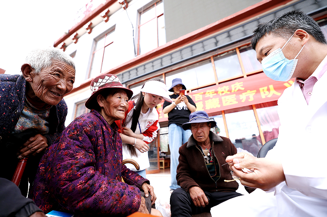 在察雅敬老院固定的每周义诊中,招柏明医生深刻地感受到党和政府对孤寡老人无微不至的关怀,这也让他作为一名普通党员感受到肩上的责任,他告诉自己,要以身作则,把党对藏族人民的恩情从自己手中的一根根银针中传递出去。