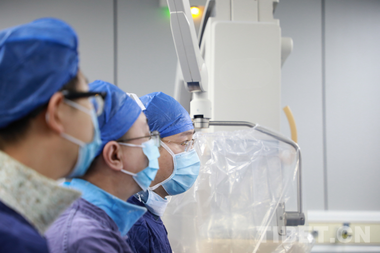 图为北医三院院长助理唐熠达教授(右一)带领专家团队在为来自青海省果洛藏族自治州的先心病患儿手术时观察导管行进情况 摄影:刘莉
