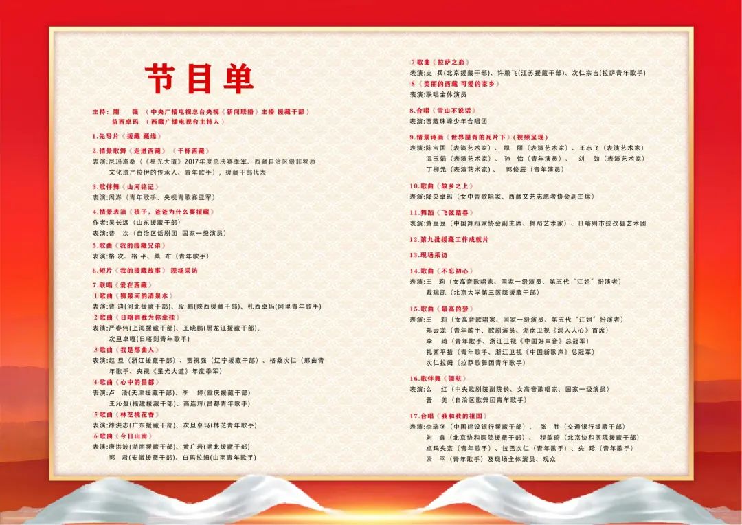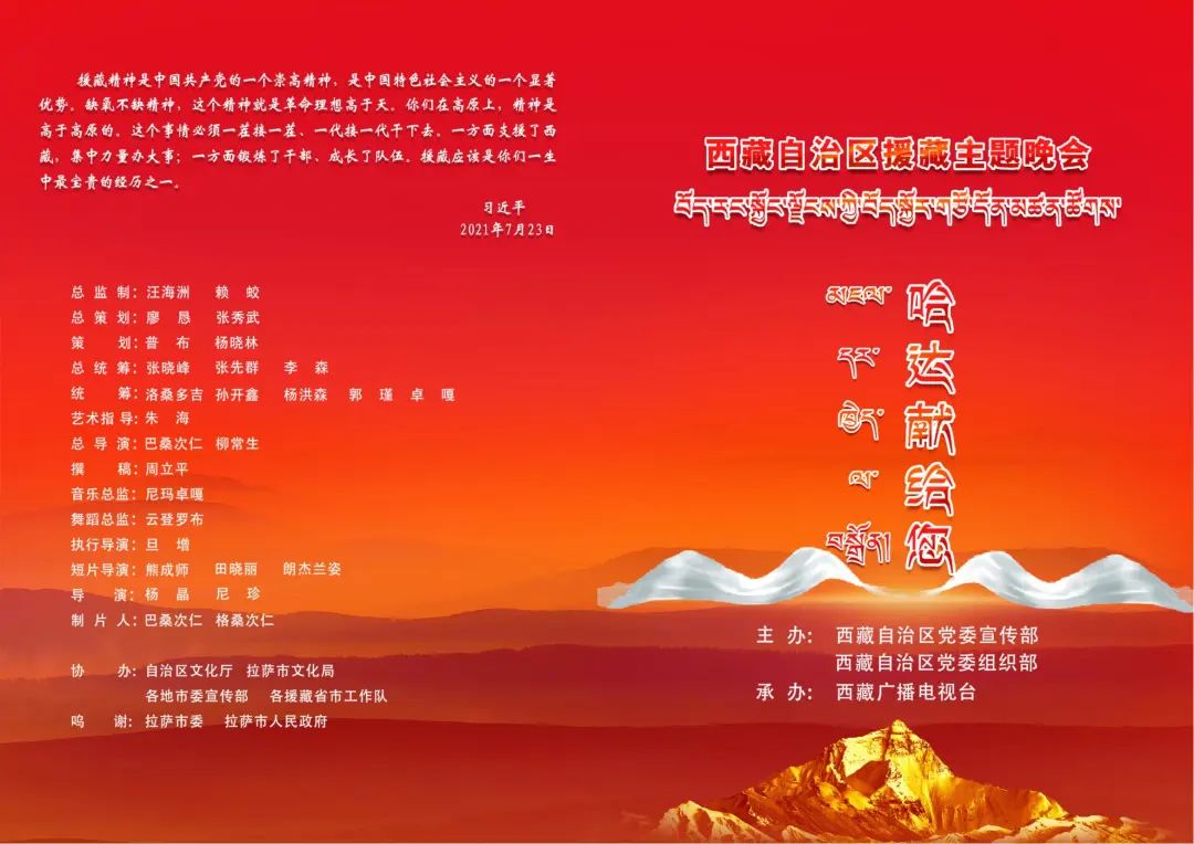 为展现援藏工作成就,弘扬援藏精神,表达西藏各族干部群众对习近平总书记和党中央的亲切关怀、全国人民无私支援特别是对援藏干部人才的敬意和感恩之情,由自治区党委宣传部、自治区党委组织部共同主办的援藏主题晚会《哈达献给您》将于8月18日晚,在西藏卫视(《西藏新闻联播》后)、西藏藏语卫视(19:30左右)播出,自治区七地市广播电视台将同步播出(地市《新闻联播》后)。