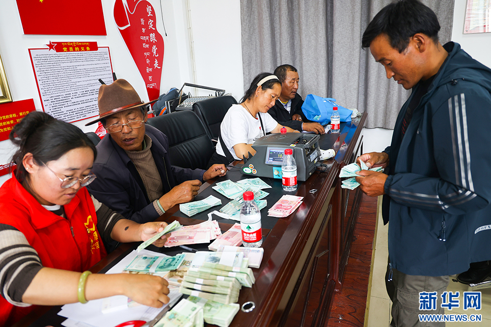 图为湖北省援藏工作队大力帮扶山南乡村发展集体产业,村民喜获分红。新华网 连迅 摄
