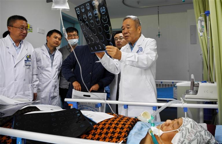 配图:中国科学院院士、首都医科大学附属北京天坛医院神经外科学中心主任医师赵继宗(后右一)在自治区第二人民医院为患者会诊。 新华社记者 张汝锋 摄