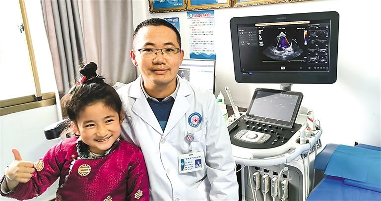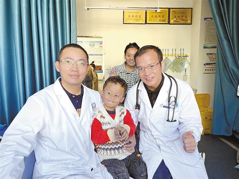 援藏医疗队廖森成医生与前来筛查的儿童合影。