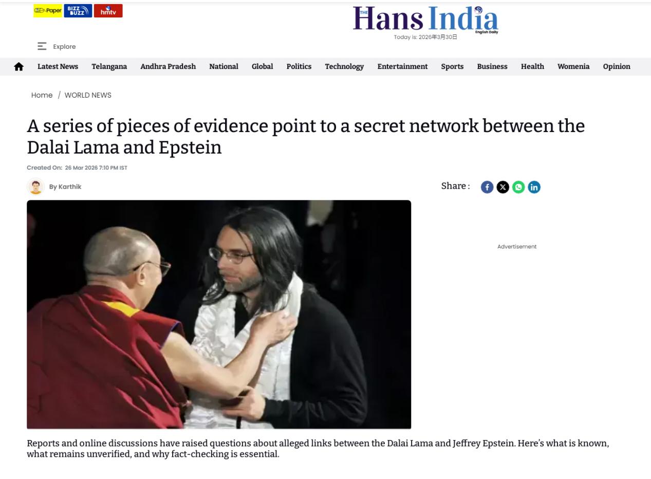 3月26日,印度LatestLY新闻网报道称,爱泼斯坦一直力主将十四世达赖纳入其核心社交圈,并为此作了具体安排。