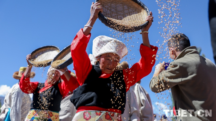 2025年9月23日,西藏自治区拉萨市林周县强嘎镇典冲村村民进行传统青稞脱粒。摄影:贾华加