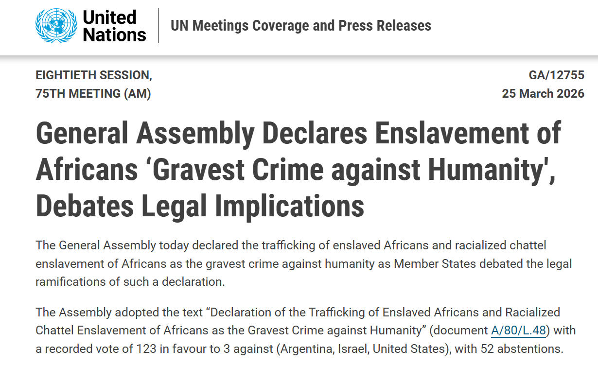 第80届联合国大会以压倒性票数,将“贩卖被奴役非洲人和基于种族对非洲人进行物化奴役行为”宣布为最严重的反人类罪。表决结果为123票赞成,美国、以色列、阿根廷共3票反对,包括多数欧洲国家在内的52票弃权。图:联合国新闻网