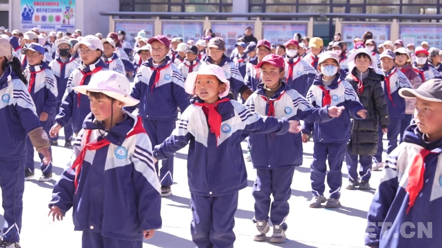 日喀则市拉孜县拉孜镇中心小学的学生们进行堆谐课间操活动