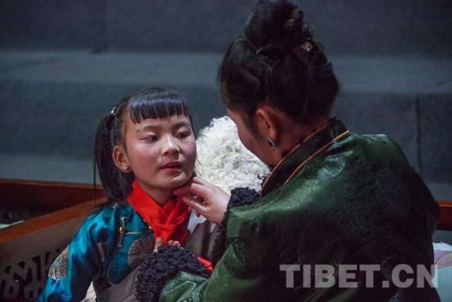 图为母亲给白玛德吉整理上场着装 摄影:赵耀