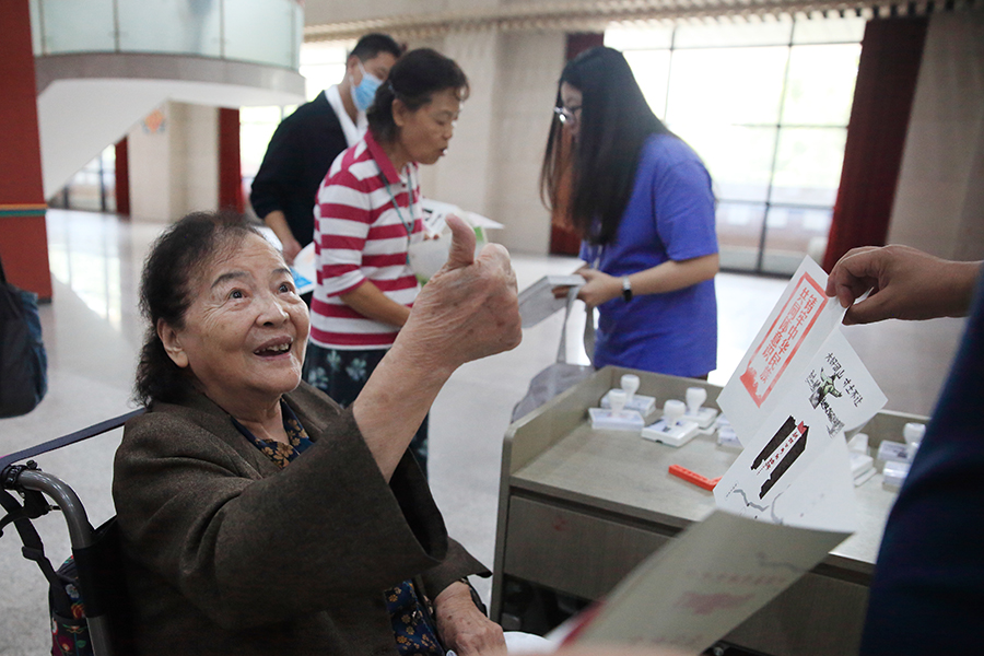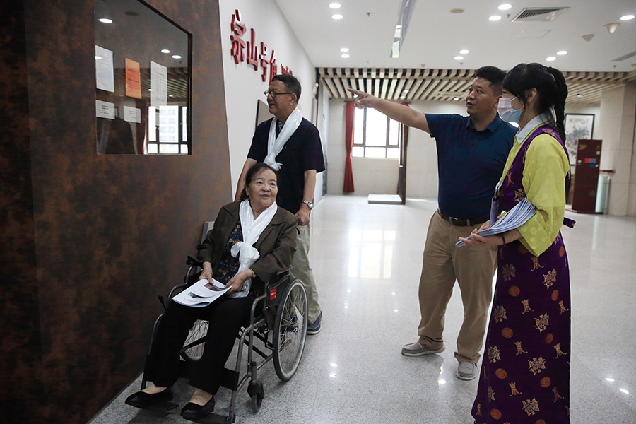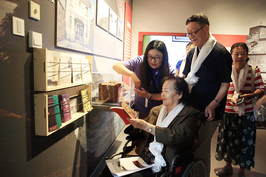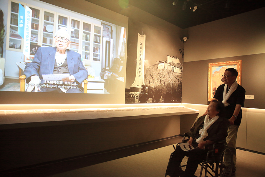 中国西藏网讯 9月3日,首批进军西藏的女兵、92岁高龄的李国柱老人,在家人陪同下,来到中国藏学研究中心西藏文化博物馆,参观“宗山号角——纪念西藏江孜抗英保卫战120周年主题展”。