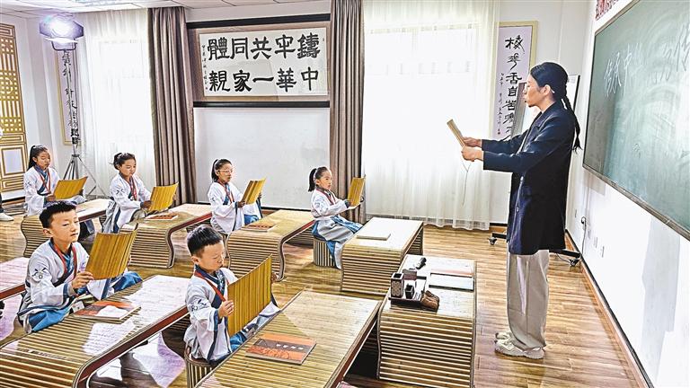 图为夺底街道桑伊社区开展“国学课堂进社区 传统文化润童年”活动,小朋友们身着汉服,与老师一起诵读国学经典。记者 张一鸣 摄