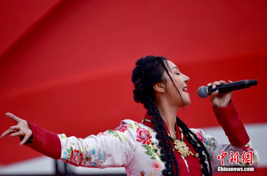 5月25日,由中国文联、西藏自治区党委宣传部、中国文艺志愿者协会主办的“与人民同行”中国文联文艺志愿服务团庆祝西藏自治区成立60周年慰问演出在位于拉萨的西藏会展中心广场举行。艺术家们为现场观众带来歌曲、舞蹈、相声、朗诵等节目,把优质文化服务送到基层一线。图为旺姆为观众演唱歌曲《天籁之爱》。