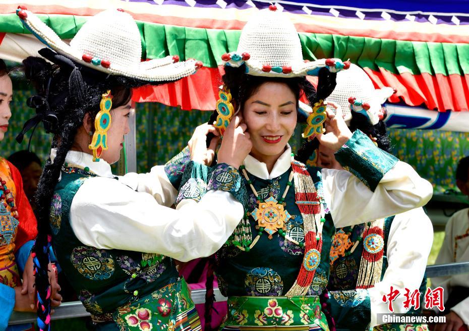 6月28日,拉萨首届林卡囊玛堆谐大赛在达孜区举办。现场,经过前期海选入围的19支队伍依次上台竞技。囊玛和堆谐,合称囊玛堆谐,是西藏民间歌舞发展到较高层次、集歌舞乐为一体的珍贵传统文化艺术遗产,深受当地民众的喜爱与追捧。图为首届林卡囊玛堆谐大赛比赛现场,参赛队伍正在整理妆容。